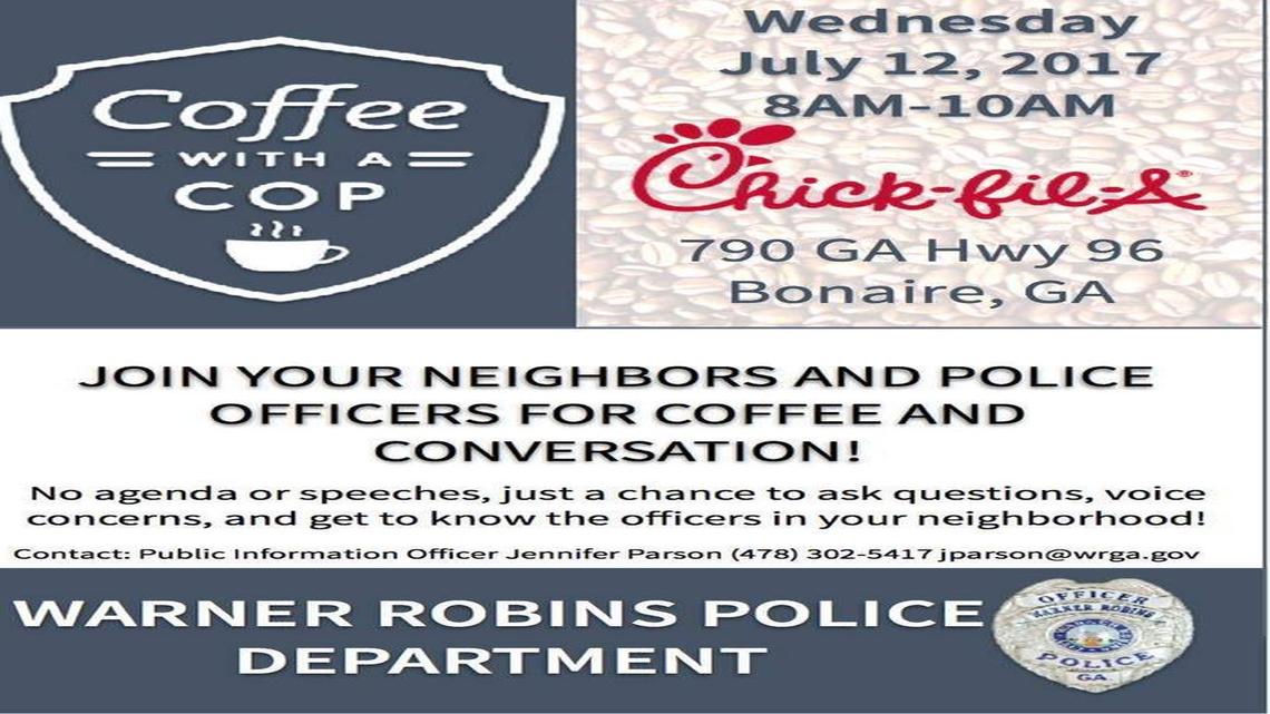 This story was originally published June 26, 2017 at 6:06 PM with the headline "Coffee with a Warner Robins cop set for July 12."