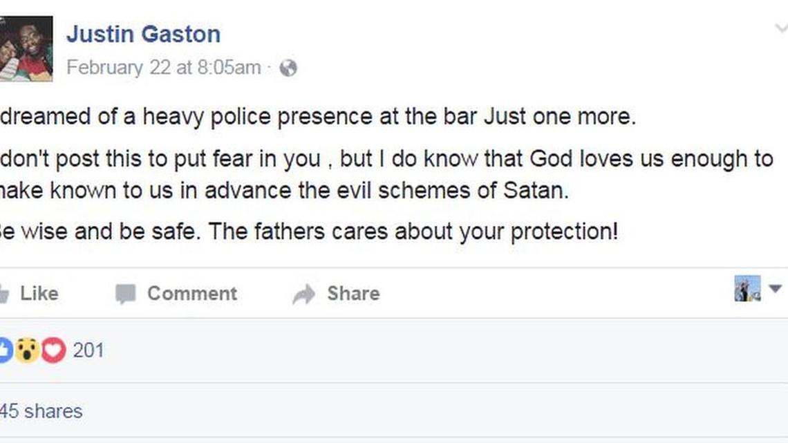 A lot of people may be taking notice if the Rev. Justin Gaston makes anymore Facebook posts warning of danger.