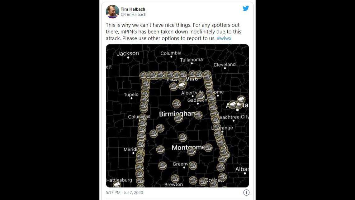 Pranksters also outlined the Alabama state border with false reports of storms, wrote Tim Halbach, a National Weather Service meteorologist on Twitter.