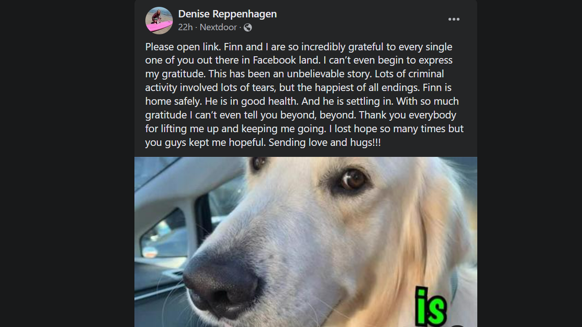 Reppenhagen told the outlet she went online and verified that the dog up for adoption there was hers. She said she believes someone adjusted Finn’s chip demographic sometime during the dognapping, which she said she found “very alarming.”